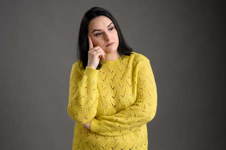 Young woman with black hair dressed casually in a yellow sweater thinks with her hand on her head posing an isolated grey background