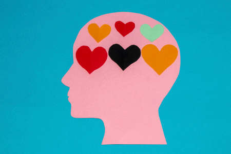 pink paper head instead of brain has a little orange heart, infatuation, flat design, human emotions,copy space