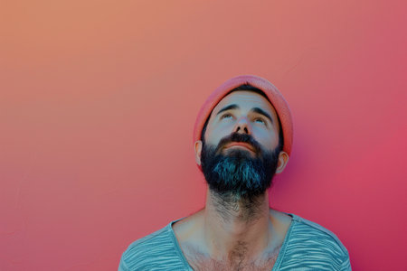 A man with a beard and a red hat is looking up at the sky. The image has a warm and cozy feeling, as the man is wearing a hat and he is enjoying the moment