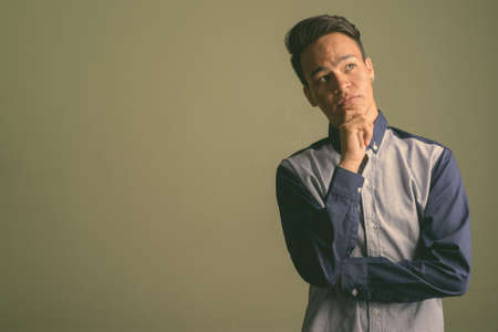 Studio shot of young teenage Indian man looking smart against colored background