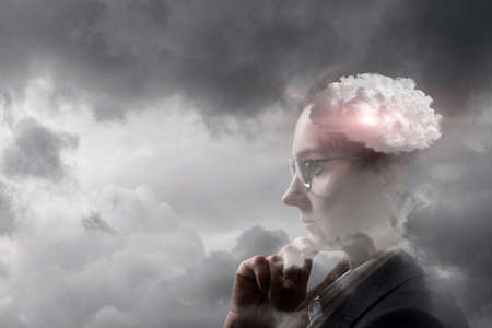 Psychology and woman mental health concept. Multiple exposure clouds and sun on female head silhouette.