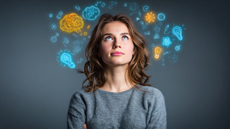 A young woman is lost in thought, surrounded by colorful icons representing ideas and creativity. This image captures the essence of innovation and inspiration.