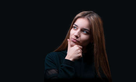 Thoughtful model in studio looking away. hand near the face