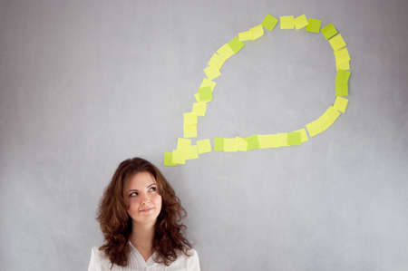 Woman looking up in deep contemplation, generating creative ideas and planning new projects against a vibrant background of many colorful sticky notes