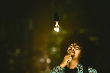 Male college student thinking an idea while looking at a bright bulb over his head and standing with blurred sparkling lights background