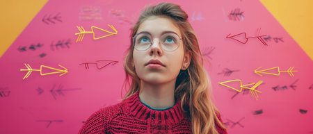 In making a choice in career or other aspects of life, a thoughtful young woman is surrounded by drawn arrows set against a pink background.