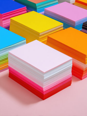 Brightly colored sheets of paper are stacked, showing a variety of hues, perfect for sticker packaging, with an empty space for additional design elements.