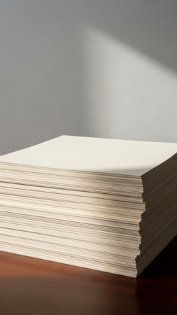 A minimalist composition featuring a stack of blank white paper illuminated by natural light, creating intriguing shadow patterns, perfect for creative projects.