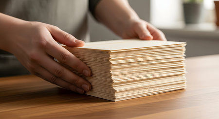 A neatly arranged stack of blank paper sheets rests on a rustic wooden table, providing an ideal setting for various creative projects and written tasks in a serene and inviting environment.