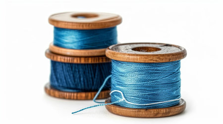 This close-up image showcases a vintage wooden spool with vibrant blue thread, capturing intricate details ideal for crafts and sewing projects.