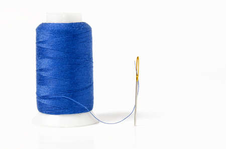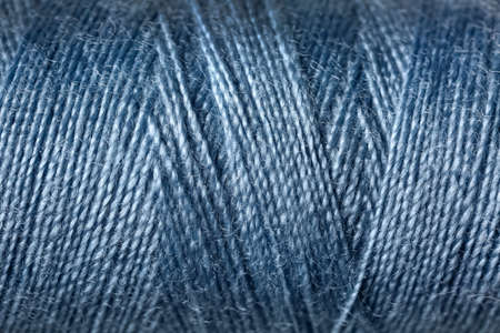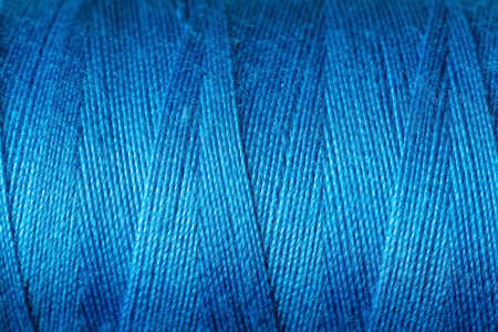 Blue sewing thread close-up with copy space. The thread is made of cotton and synthetics for the production of clothing.