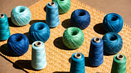 Innovative textile production, spools of blue yarn winding on traditional machinery