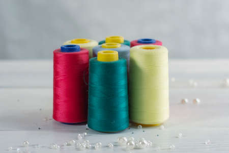 Multi-colored spools of sewing threads close-up. Craft and hobby concept