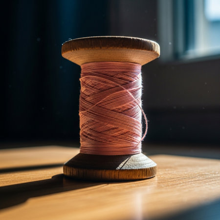 Low-angle, cinematic close-up of a perfectly wrapped pink thread bobbin, lit by harsh sunlight and d