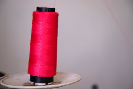 A coral spool of threads on coral paper background, with copy space. Coral color
