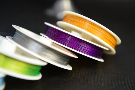 Close up Rolls of Vintage Colorful Threads. Clothes Repair, Black Dark Background. Sewing work
