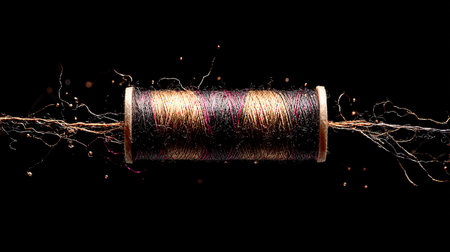 A close-up view of a spool of yellow thread with a needle threaded through it. The image captures the intricate details of sewing materials against a dark background, highlighting the texture and color of the thread. ai generated.