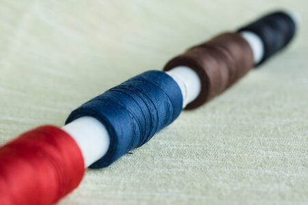 Colorful threads for sewing. Different threads on wooden vintage reels.