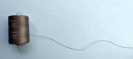 Old rusty needle and strong twine. Accessories for the leatherworker in the workshop. Dark background.
