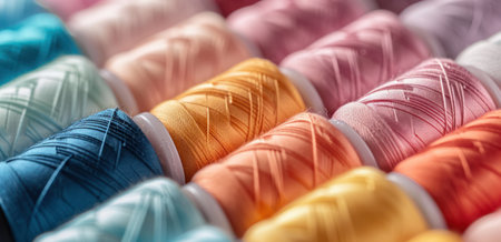 Colorful spools of sewing thread neatly arranged in rows, showcasing a vibrant array of hues. Textiles and crafting concept.