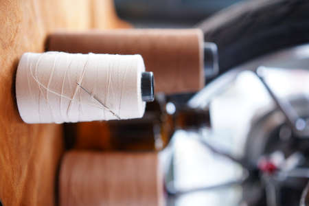 Colorful threads for sewing. Different threads on wooden vintage reels.