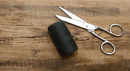 Sewing kit. Scissors with thread and needles on wooden table