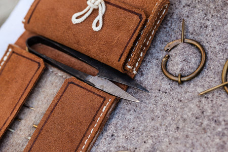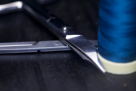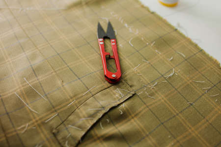Tailor's snipper for cutting threads with a piece of fabric and sewing accessories. View from above