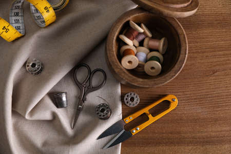 Set of sewing supplies and accessories on wooden table, flat lay