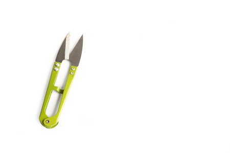 Green stainless steel scissors on a white background with copy space