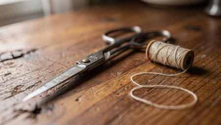 Scissors Spool Thread On Table, Tailor Preparing Materials For Mending, Rustic Workbench With Worn Wood Texture, Closeup Of Metal Shears And Wrapped Twine, Focused Craft Atmosphere, Tools