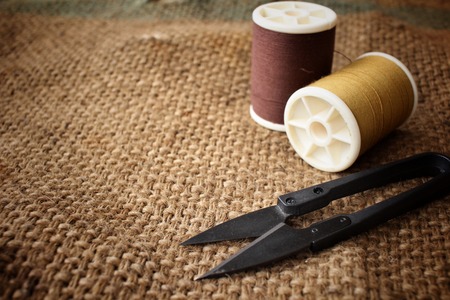 Sewing threads with scissors on sackcloth