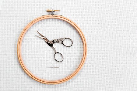 minimalistic flat lay about cross-stitch: a wooden hoop, needle and scissors for needlework on a white canvas aida 16 count