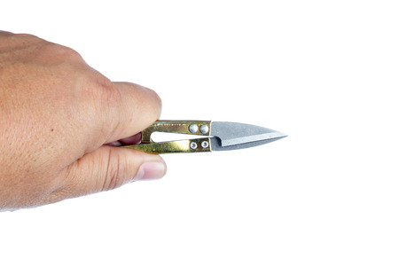 hand holding used small scissor, isolated on white background