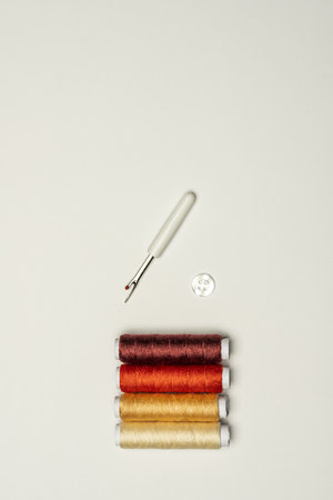 still life with spools of thread of various colors, a white button and a sewing utensil