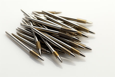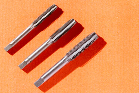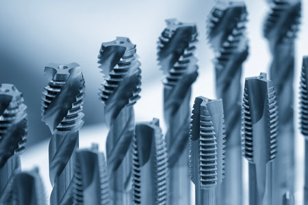 Set of thread taps, industrial metalworking tools, close-up shot, shallow depth of field