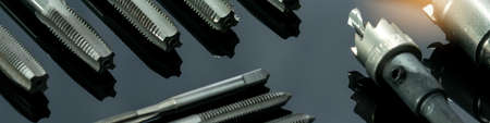 Closeup straight flute tap tip and hole saw on dark background. Industrial tapping tools. Carbide tip metal cutter. Metalworking hardware. Mechanic tools. Drilling equipment. Mechanical engineering.