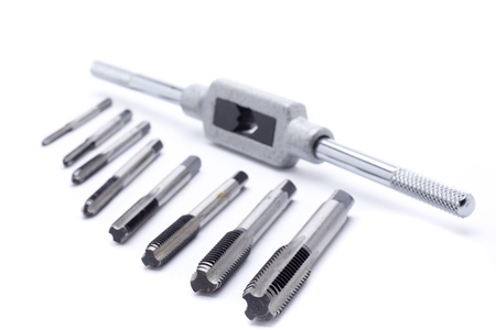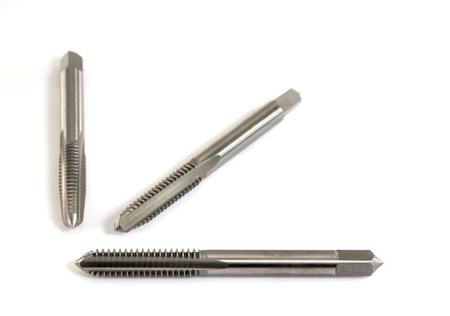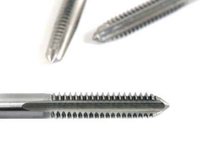 Manual tap for cutting threads in metal on a white background. Copy space. Metal processing tool.