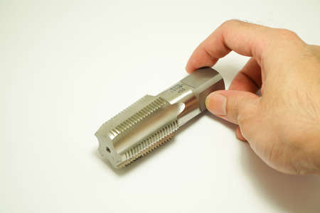Mechanic's hand tapping threads on a white background,concept of choosing a thread size,screw hand tap cutting tool. Right spiral flute.