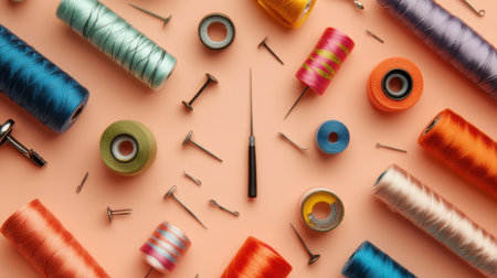 A vibrant and artistic display of colorful threads, spools, and sewing tools set against a soft peach background, perfect for creative projects and inspiration.