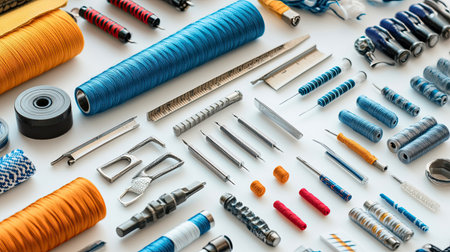 A vibrant collection of sewing supplies and tools is beautifully arranged on a flat surface. This image captures essential items including colorful spools of thread, needles, scissors, and measuring tools, perfect for craft enthusiasts and textile projects.