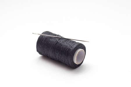 Spool of waxed black sewing threads with neadle
