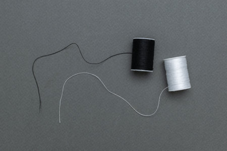 Black and White Thread Spools on Textured Gray Background: Minimalist Sewing Supplies