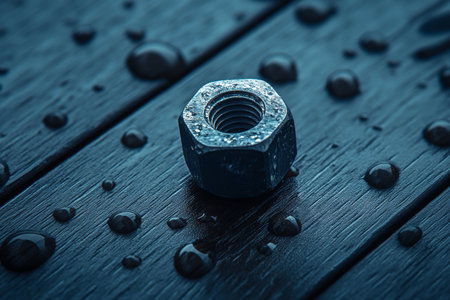 A close-up image of a metal bolt and nut showcasing intricate details and reflections on a dark surface with water droplets. Perfect for industrial themes.