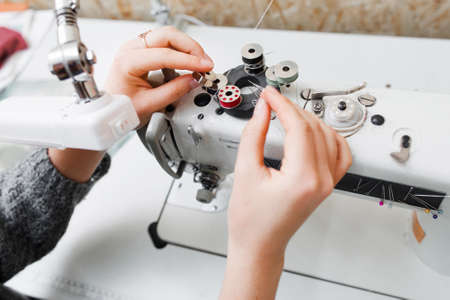 The workplace of a seamstress. The dressmaker works on a sewing machine. A tailor threads a thread into a sewing machine at his workplace. Hobby-sewing as a small business concept. High quality photo