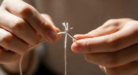 A detailed close-up view of hands carefully threading a needle. The focus highlights the precision required for sewing, tailoring, or embroidery work.