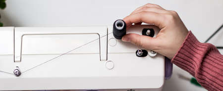 Seamstress replace bobbin in the sewing machine. Close-up of sewer hands preparing equipment for making clothes. Sewing process concept