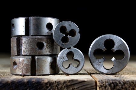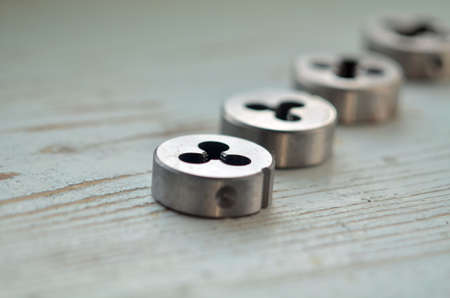 Threading dies, Old used kit for cutting an external thread, close up, top view, stylized