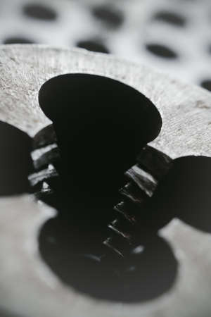 Old rusty screw thread being adjusted on a metal surface, concept image for manual labor, industry and construction