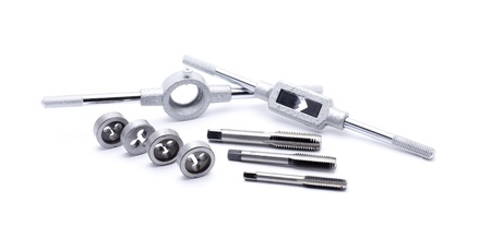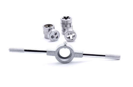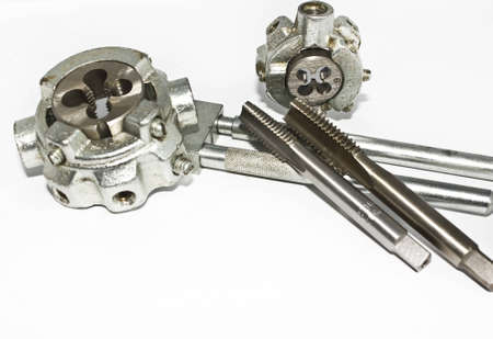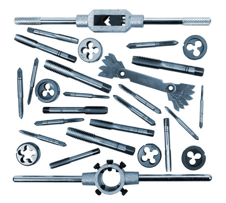 Set of taps and dies for threading on a white background