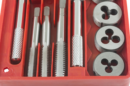 Old used kit for cutting an external thread isolated on white background. tap and dies spiral flute. Cutting tool make thread for right screws.